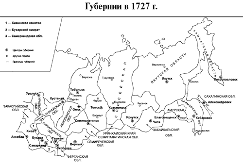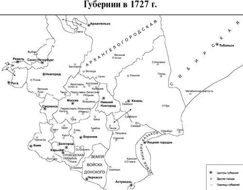 3. Реформа 1727 года упразднила дистрикты, частично заменив их уездами. Эта реформа также продолжила процесс разукрупнения губерний, начавшийся в1719году: были образованы Белгородская и Новгородская губернии, изменились границы Санкт-Петербургской, Московской и Сибирской губерний. Всего после реформы 1727 года в империи насчитывалось 14 губерний иоколо250уездов. Эта сетка АТД оставалась достаточно стабильной на протяжении нескольких десятилетий (лишь в1744 году были созданы Выборгская и Оренбургская губернии).