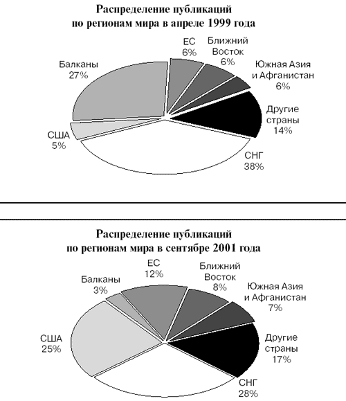 Основными поставщиками новостей для НГ за это время продолжали выступать Белоруссия, Украина, Грузия, Азербайджан и другие страны СНГ. Но лидером интереса СМИ, причем не только печатных, но и электронных, стали США. Это произошло во многом по причине известной сентябрьской катастрофы в городах Америки, потянувшей за собой масштабный информационный след. На счету США за октябрь 2000-го — сентябрь 2001 года накопилось почти 16% публикаций, а доля публикаций о США в «черном» сентябре 2001 года сверхвысока— четверть от всего месячного объема. Такого не было даже в апреле 1999 года, когда все СМИ России бурлили вестями с Балкан, где в то время начиналась военная операция НАТО (см. диаграммы).