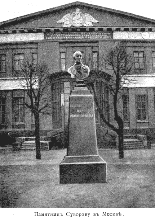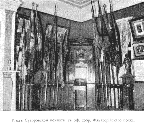 Гордостью музея 11-го гренадерского Фанагорийского генералиссимуса князя Суворова полка, расквартированного в 1910-х годах в Москве, являлся Суворовский отдел, в котором находились предметы и документы, связанные сименем величайшего русского полководца и его семьи. Этот полк был сформирован 25 мая 1790 года Александром Васильевичем Суворовым по приказу Григория Александровича Потемкина. Название «Фанагорийский» первоначально получил 4-й гренадерский полк в 1785 году, при назначении его шефом Суворова, покорившего город Фанагорию при устье реки Кубани. В созданный Суворовым 11-й гренадерский полк были включены батальоны бывшего Фанагорийского полка; новый полк получил это же название, и Суворов стал его шефом. О значении этого звания для полка говорит следующий факт. Во время маневров под Красным Селом в 1845 году император Николай I подъехал к полку и сказал: «Я желал бы быть шефом Фанагорийского Суворовского полка, но у вас уже есть Шеф — бессмертный Суворов; итак, мне остается только просить у вас, Суворовцы, позволения надеть ваш мундир и начать собою ваш полковой список». Этот мундир впоследствии был передан в полковой музей, а перед зданием офицерского собрания одновременно с устройством музея поставлен памятник— бюст Суворова с надписью: «Бессмертному Шефу — Фанагорийцы».