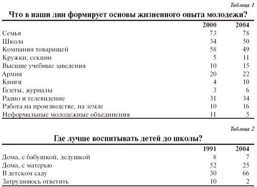 Хотя главной средой, призванной обеспечить формирование ребенка, подавляющее число респондентов безоговорочно признает семью, обсуждение реальных условий воспитания выявляет значительную роль иных сред и институтов. Так, даже родители самых маленьких детей считают лучшим местом для дошкольного воспитания детский сад, а домашнему воспитанию отдает предпочтение не более трети опрошенных. Хотя с взрослением детей традиционный декларативный примат семьи сохраняется (о нем заявляют 78 процентов опрошенных), роль внесемейного окружения в их формировании резко повышается. На второе по значимости место в воспитании молодежи претендуют школа и неформальное окружение подростков — компания товарищей (половина респондентов называет вторым по важности агентом социализации либо школу, либо приятельский круг). Следующими по мере убывания значимости признаются СМИ (40 процентов), армия (23 процента), трудовой опыт и вузы (по 15 процентов), а также книги, кружки и секции (по 10 процентов).