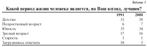 Весьма показательно, что «зрелый возраст» (который, разумеется, несколько «толерантнее» оценивается именно старшими возрастными группами) в среднем оценивается значительно ниже, чем юность и детство, негативный «провал» между которыми образует «подростковый возраст» (почти в два раза чаще лучшим периодом его назвали только самые молодые).