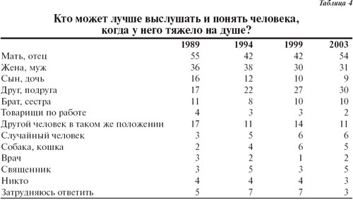 На протяжении всех 1990-х годов и вплоть до последнего времени к проблемам, осложняющим жизнь семьи, около двух третей опрошенных относят материальные: «низкие доходы, нехватка денег». Около трети респондентов сетуют на плохое здоровье и неудовлетворительное лечение, а для одной пятой вечной проблемой остаются бытовые трудности. И хотя можно было бы ожидать, что «бедность» и «здоровье» скорее заботят старшее поколение и менее образованных, не адаптировавшихся к «новой жизни» людей, анализ показывает, что они значимы практически для всех групп, включая и более молодых.