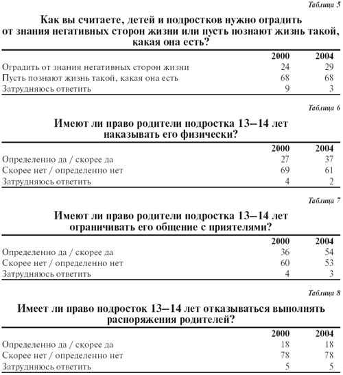 На вопрос, в каком возрасте заканчивается детство и начинается взрослая жизнь, практически во всех социально-демографических группах называется возраст окончания школы (и прежний возраст получения паспорта) — 16 лет. Подавляющее большинство (73 процента) выступает за снижение возраста полной уголовной ответственности до 16 лет. Вместе с тем установка на родительскую опеку, контроль и подчинение сохраняется не только по отношению к детям этого юного возраста, но в существенной мере практикуется родителями вплоть до того момен та, когда их дети покидают родительский дом и начинают самостоятельную жизнь. Например, родители, считающие, что их выросшие дети (группа 18–24 лет) не должны жить отдельно, объясняют свое мнение главным образом так: «дети не готовы к самостоятельной жизни, не имеют навыков организации собственного быта» (53 процента), «жизнь отдельно от родителей ослабляет родительский контроль, дети могут пойти по неправильному пути» (45 процентов).