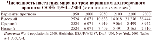 Отдел народонаселения ООН разрабатывает сверхдолгосрочный прогноз изменения численности населения мира, его регионов и отдельных стран до 2300 года. Пока опубликованы только предварительные результаты этой работы[1], но и они позволяют судить о возможных изменениях демографической ситуации — во всем мире, в отдельных регионах и странах. Речь, разумеется, идет не о детальных предсказаниях — для этого сейчас нет реальных оснований. Авторы прогноза пытаются прочертить основные возможные траектории мировой демографической динамики, которые они связывают в первую очередь с различными сценариями снижения рождаемости в мире.