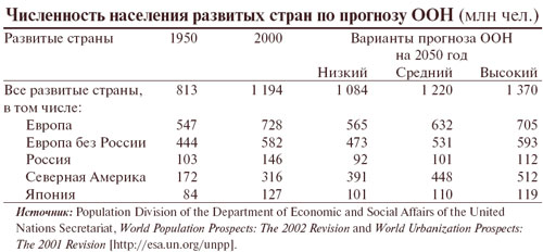 Во всех странах «Северного кольца» установился демографический режим, подводящий их к границе депопуляции или уже сейчас делающий эту депопуляцию реальностью. Никакой перспективы сколько-нибудь значительного роста численности населения этих стран за счет внутренних источников нет. Согласно всем прогнозам, даже при самом оптимистическом варианте оно может лишь незначительно увеличиться — за счет США и Канады. Россия — часть развитого «Севера», и население России, так же как и население всей Европы, обречено на сокращение (см. табл. 3).