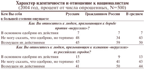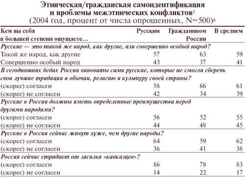 Стоит заметить, что гражданская самоидентификация отнюдь не означает свободы от шовинистических предрассудков, но лишь смягчает их проявления. Так, представление о «засилье кавказцев» разделяет подавляющее большинство обеих групп. Незначительны и различия между этими группами по отношению к идеям «борьбы с нерусскими» и изгнания их из русских городов. А по вопросу о праве русских на исключительное положение в сравнении с другими народами мнения распределились примерно одинаково.