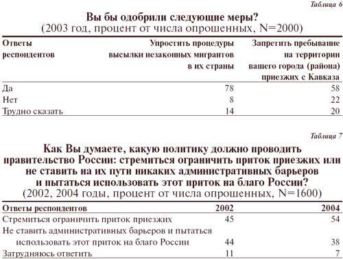 Тот факт, что многие считают «нерусских» граждан России, не говоря уже о приезжих из бывших республик СССР, не вполне полноправными ее жителями, находит выражение в поддержке всевозможных ограничительных, а иногда и репрессивных мер по отношению к ним. Более половины опрошенных устойчиво поддерживают меры по ограничению числа приезжающих в Россию (а в определенных ситуациях доля одобряющих соответствующие меры может быть и существенно выше).