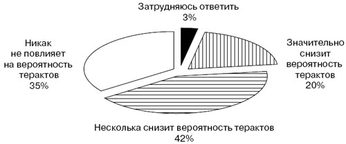 Рисунок 4. Как Вы думаете, приведет ли к снижению вероятности террористических актов в Москве усложнение процедуры регистрации приезжающих в Москву? (2003 год, процент от числа опрошенных (московский опрос), N=500)