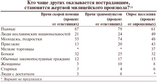 Как минимум половина опрошенных отмечает, что милицейский произвол часто провоцируется национальностью и «неместным» происхождением его жертв. Очевидно, что практика преследования людей по этническому признаку стала в восприятии многих граждан России делом привычным, «житейским». Они считают иноэтничность более распространенным поводом для милицейского преследования, чем принадлежность к другим «группам риска» — пьяницам, бомжам, подросткам.