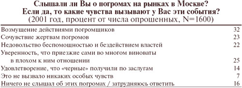 В то же время лишь треть опрошенных однозначно негативно воспринимает известия о реальных преступлениях националистических и фашиствующих групп. Реакции большинства варьируются от соболезнования жертвам погромов и недовольства беспорядками до злорадного удовлетворения тем, что «черные получили по заслугам».