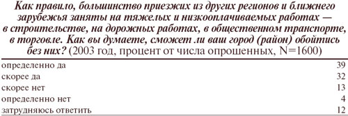 При этом нелюбовь к приезжим носит не идеологический характер (реальная база поддержки националистов не превышает пяти-семи процентов, рекрутируемых из маргинальных молодежных групп), а скорее инструментальный, бытовой, ситуативный. Негативное отношение к мигрантам сигнализирует о внутренних напряжениях в современном российском обществе, о значительной распространенности понижающего типа социальной адаптации, о непреодолимых барьерах, мешающих социальной мобильности, а также формированию позитивных жизненных стратегий и их реализации.