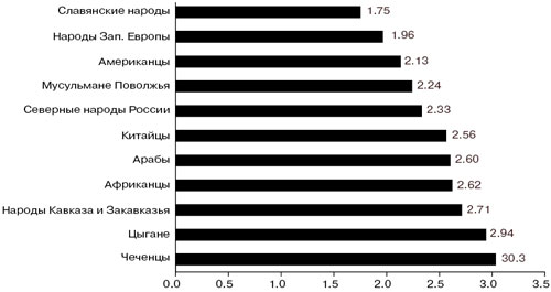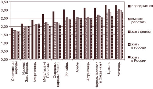 Иерархическое восприятие этносов ведет к выстраиванию своеобразной шкалы социальной дистанции, характеризующей степень «чуждости» той или иной этнической группы и, соответственно, готовность к взаимодействию с ней в том или ином качестве. Помимо культурно близких, едва ли не тождественных русским украинцев и белорусов, а также мифических «западных» иностранцев, в зоне «приемлемости», если принять за ее границу значение индекса социальной дистанции 2,5 (см. рис. 1), оказываются лишь мусульмане Поволжья (татары, башкиры и др.) и северные народы (якуты, чукчи и др.), традиционно входившие в состав России и ныне не вызывающие отторжения. Народы же Кавказа и Закавказья (в частности, чеченцы) в восприятии опрошенных оказались даже более далекими, чем народы, никогда не жившие в России и представляющие иные континенты. «Кавказцев», наряду с традиционно враждебно воспринимаемыми цыганами, наименьшая доля опрошенных готова принять даже в качестве жителей страны, не говоря уже о более тесных формах возможного взаимодействия.