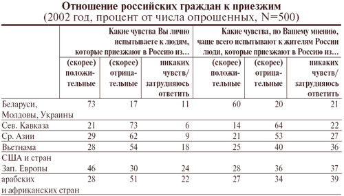Характерно, что респонденты считают приезжих, как правило, менее враждебными, чем себя, т. е. настороженность русских имеет «опережающий» характер и превосходит воображаемую неприязненность чужаков. Два исключения из этого правила: отношение к «братским» народам (славянам и молдаванам), а также к американцам и западноевропейцам, которые подозреваются в более прохладном отношении к принимающей стороне. Такая неравномерность может указывать на бoльшую значимость этих связей, ожидание более теплого и справедливого отношения, отсутствие которого воспринимается как нечто обидное.