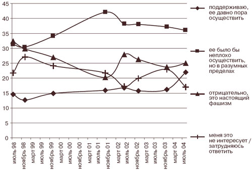 Рисунок 3. Как Вы относитесь к идее «Россия для русских»? (1998–2004 годы, процент от числа опрошенных, N=1600)