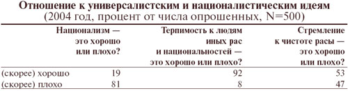 Амбивалентное отношение к националистическим идеям, характерное для значительной части российского общества, отражает конфликт между закреплявшимися годами в государственной идеологии лозунгами братства народов и практикой бытовой ксенофобии, значительно обострившейся за последние годы практически во всех социальных группах, вне зависимости от их демографических и социально-экономических характеристик и ценностно-политических установок[9].