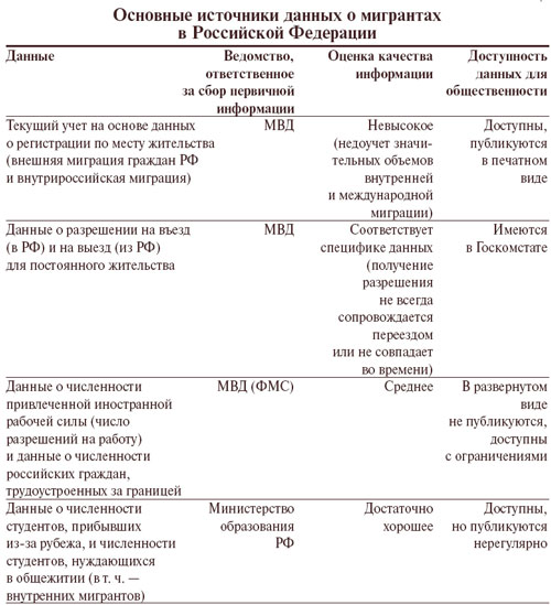 В настоящее время в России существуют или находятся в стадии создания не менее десяти систем сбора статистической информации, касающейся отдельных категорий мигрантов. Теоретически эти системы должны собирать данные о мигрантах всех категорий — внутренних и внешних, граждан России и иностранцев, долгосрочных (намеревающихся жить на новом месте не менее года) и краткосрочных[1]. Однако ни одна из них не позволяет описать миграционную ситуацию полностью.