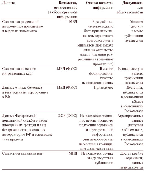 Комбинировать или сравнивать поставляемые ими данные крайне сложно, так как методики сбора и обработки первичной информации не согласованы. В одних системах определяется число мигрантов той или иной категории (например, лиц, ищущих убежища), в других — регистрируется число событий, а не людей (как это делает пограничная статистика). В настоящее время ведется работа по объединению всех источников информации об иностранных мигрантах в рамках Центрального банка данных по учету иностранцев. К сожалению, большинство административных источников закрыты для общественности даже в тех случаях, когда для этого нет оснований, а доступ к агрегированным данным часто зависит от личных знакомств и связей.