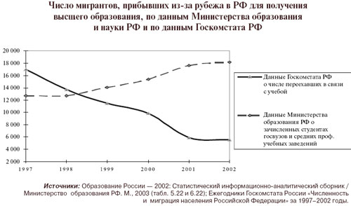 Опубликованные за последние годы данные Госкомстата о числе лиц, сменивших место жительства в связи с учебой, показывают быстрое уменьшение объемов учебной миграции в России, в том числе и внутренней. К счастью, на самом деле ничего подобного не происходит: «уменьшение» объясняется лишь тем, что после введения в середине 1990-х годов новой системы регистрации многие паспортные столы заменили регистрацию студентов по месту жительства (с составлением листка статистического учета мигранта) на регистрацию по месту пребывания. Ранее иногородние студенты, как правило, регистрировались по месту жительства, так как заключали с администрацией учебного заведения договор аренды помещения (общежития), дававший право на постоянную регистрацию (это было намного логичнее, ведь обучение в средних специальных и высших учебных заведениях России длится не менее четырех лет, а в аспирантуре — два-три года). Еще хуже то, что в разных регионах нет единого подхода к этому вопросу и какая-то часть учебных мигрантов все-таки попадает в поле статистического учета.