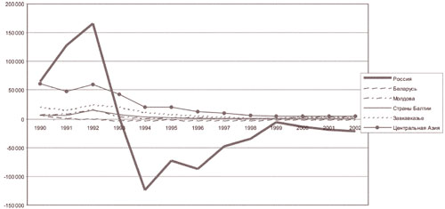 Рис. 2. Миграционный прирост (уменьшение) за счет миграции между Украиной и государствами СНГ и Балтии в 1990–2002 годах (в тысячах человек)