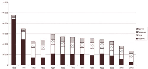 Главными странами назначения для эмигрантов были и остаются Израиль, Германия, США. Доля выбывающих в Израиль с незначительными колебаниями год от года сокращалась (38,9 процента в 1995 году; 31,3 процента в 2001 году; 19,7 процента в 2002 году). Выезд в Германию, США и другие страны, наоборот, возрастал; например, если в 1991 году в Германию выехало лишь немногим больше двух тысяч человек, то в 2002 году — 10,7 тысячи.
