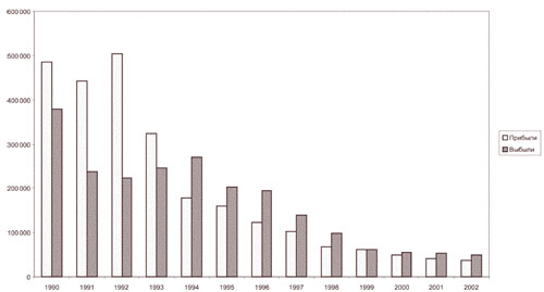 Наиболее интенсивным выезд в направлении дальнего зарубежья был в 1990 году, когда страну покинули свыше 90 тысяч человек. В 1991 году эмигра ция сократилась — около 70 тысяч, в 1992 году продолжала уменьшаться. Однако в 1994 году она снова возросла — 58,7 тысячи человек. Это был наивысший показатель за весь период независимости. Такой подъем был вызван глубоким экономическим кризисом. В последующем эмиграция в дальнее зарубежье стабильно сокращалась. В 2002 году она составила 26,7 тысячи человек, т. е. почти втрое меньше, чем в 1991 году (рис. 3).