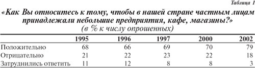 Пожалуй, только приватизация жилья была изначально поддержана практически всеми россиянами, даже несмотря на то, что ее последствия, прежде всего в отношении порядка и масштабов оплаты, были совершенно непрозрачными. Кроме того, достаточно широкой поддержкой пользовалась приватизация мелких предприятий, сферы торговли и услуг (табл. 1), а также небольших земельных участков — тех объектов, которые не выходили за рамки «обывательской сферы», т. е. частной, повседневной жизни.