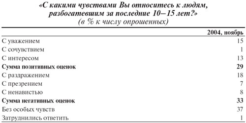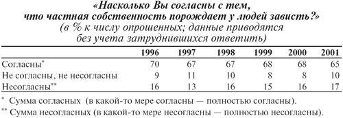 Наиболее распространенной массовой реакцией на появление в стране очень богатых даже по мировым меркам людей является неприязнь и раздражение. Хотя лишь незначительная часть опрошенных (три-четыре процента) «признается» в том, что разбогатевшие за последние полтора десятка лет люди вызывают у них лично чувство зависти, тем не менее подавляющее большинство согласно с тем, что «частная собственность порождает у людей зависть» (см. табл. 2).