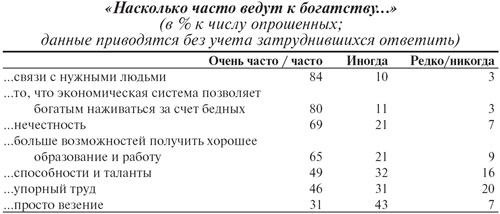 Важно, что представления о том, каким образом человек в нашей стране может разбогатеть, формируются, как и в советскую эпоху, на фоне чувства собственной социальной ущемленности, недееспособности, зависимости от обобщенных «других». Так, по мнению подавляющего большинства, богатство может быть нажито только благодаря «большим связям», готовности нарушать закон или начальному «социальному капиталу» (т. е. возможности получить хорошее образование и работу). Личная инициатива и целеустремленность в этом контексте оцениваются ниже всего. Существенно и то, что среди факторов, способствующих обогащению, ведущая роль отводится самой экономической системе, оцениваемой негативно (см. табл. 4).