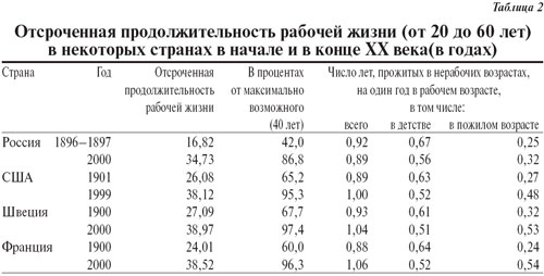 Когда-то это отличие было очень большим, но, как видно из табл. 2, снижение смертности в ХХ веке привело к значительному сближению фактической и предельно возможной отсроченной продолжительности рабочей жизни, в некоторых странах оставшиеся различия составляют менее 3%. Это небывалое гуманитарное достижение и одновременно источник огромного экономического выигрыша.