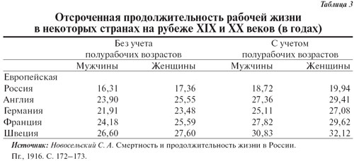 Фонд рабочего времени поколения был очень маленьким, его поневоле приходилось расширять за счет более молодых и более пожилых, т. е. за счет тех, кого известный русский демограф С. Новосельский отнес когда-то к «полурабочим» возрастам. Он рассчитал отсроченную продолжительность рабочей жизни в России и в других странах на рубеже XIX и XX веков, считая рабочими, как и мы, возрасты от 20 до 60 лет, а полурабочими — от 15 до 20 и от 60 до 70 и принимая год жизни в этих возрастах за полгода рабочей жизни. Это дало прибавку, но не такую уж большую. Вот что у него получилось (см. табл. 3):