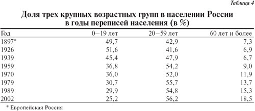 Старение населения — всемирный процесс, он затрагивает все страны и везде порождает сходные проблемы. В России старение началось позднее, чем в большинстве европейских стран, но тоже продвинулось уже очень далеко (см. табл. 4).