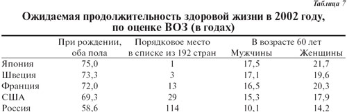 Учтем еще различия в продолжительности здоровой жизни. Этот показатель стал оцениваться сравнительно недавно, и его нельзя считать столь же точным, как показатель общей продолжительности жизни: достоверность фиксации момента смерти и момента наступления хронического нездоровья, инвалидности, конечно, различна. Но все же методика оценки продолжительности здоровой жизни развивается, и Всемирная организация здравоохранения регулярно производит такую оценку для всех стран. Воспользуемся ею и увидим, что достигший нынешнего пенсионного возраста мужчина в России имеет в среднем шанс прожить, оставаясь здоровым, только примерно три четверти оставшейся ему жизни — на пять-семь лет меньше, чем его сверстник в Европе, Америке или Японии (см. табл. 7).