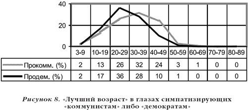 Анализ выявляет зависимость представлений и от совсем, казалось бы, иного группообразующего признака — политических симпатий. Возьмем все еще релевантное для старшей части общества, хотя и теряющее уже свою остроту, разделение политизированной части нашего общества на симпатизирующих «коммунистам» и «демократам». Вот как распределяются среди этих групп мнения о «лучшем возрасте»: