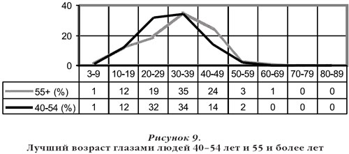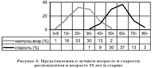 Рисунок 6 показывает, что думают лица старшего возраста о начале старости. Небольшая зона пересечения диаграмм означает, что где-то между 40 и 55 годами для некоторых старость уже наступила, но жизнь еще казалась прекрасной. Но в глазах абсолютного большинства россиян старость — отнюдь не лучший возраст, и лучший возраст — отнюдь не старость.