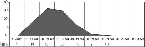 Никто не назвал возраст моложе 4 лет, и никто (для нашей темы это существенно) — старше 65 лет. Средняя по ответам всех опрошенных величина падает на двадцать восемь с половиной лет. На приводимой ниже диаграмме, имеющей форму горы, этот возраст указывает на ее «вершину»: