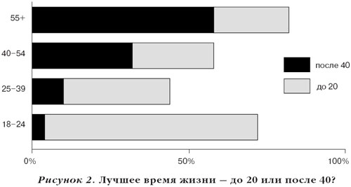 Казалось бы, каждое поколение хвалит собственный возраст. Но нет. По данным опроса получается, что хотя старшие поколения склонны сдвигать пик бытия на более поздний возраст, они считают лучшим период, ими самими уже прожитый. А самые младшие, хоть и указывают на гораздо более ранний этап жизни, чем старшие, но в половине случаев ожидают, что лучшее время у них еще впереди. В возрасте же, который общество признало наилучшим, т. е. среди тех, кому 25–39 лет, не более половины видят самым прекрасным свое собственное время, а не менее трети считают, что лучшие годы для них уже в прошлом.