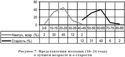 А теперь рассмотрим представления людей в возрасте 18–25 лет. Как видим, в их сознании «лучшие годы» и годы старости вообще не пересекаются: кончаются лучшие годы, и начинается старость.