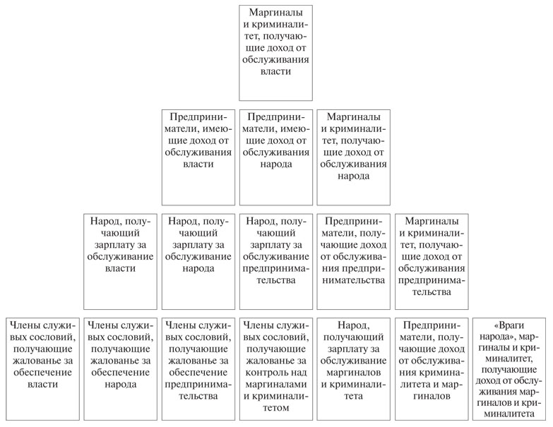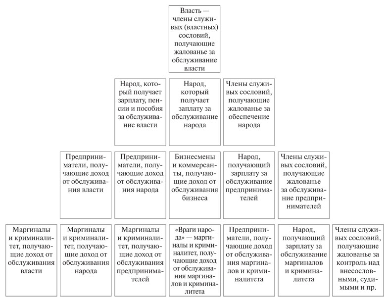 С верхней группой «первых лиц» в этом варианте иерархической структуры субординирован «народ», получающий зарплату, пенсии и пособия за обслуживание власти и народа. Совместно с членами служивых сословий, которые этот «народ» обеспечивают, получая за это жалованье, премии и выплаты, он составляет второй уровень иерархии.