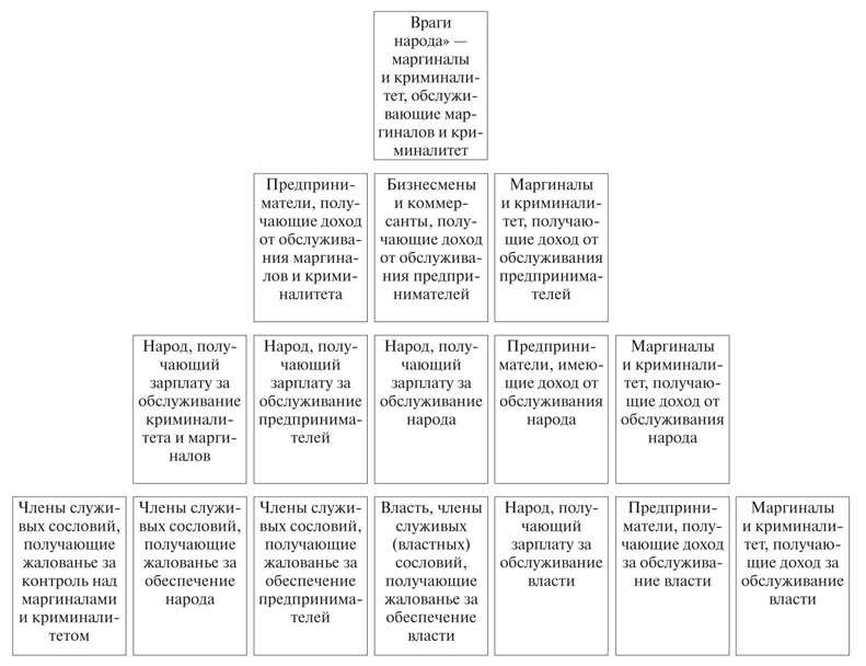 Высшей социальной группой в этом представлении являются профессиональные преступники, авторитеты и законники. Им субординированы группы криминализованных предпринимателей, профессиональных предпринимателей, маргиналы и преступники, обслуживающие предпринимателей. Третий уровень иерархии составляют разные группы «народа» и те маргиналы и преступники, которые с народом ассоциированы. Наконец, четвертый уровень иерархии составляют разные группы служивых сословий, обеспечивающих маргиналов, часть «народа» и предпринимателей, занятых обслуживанием власти, а также маргиналы и преступники, обслуживающие власть.