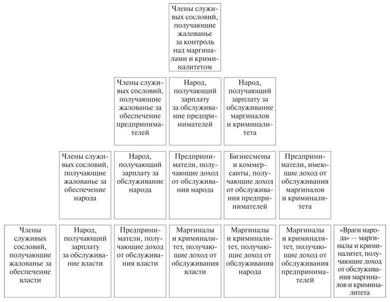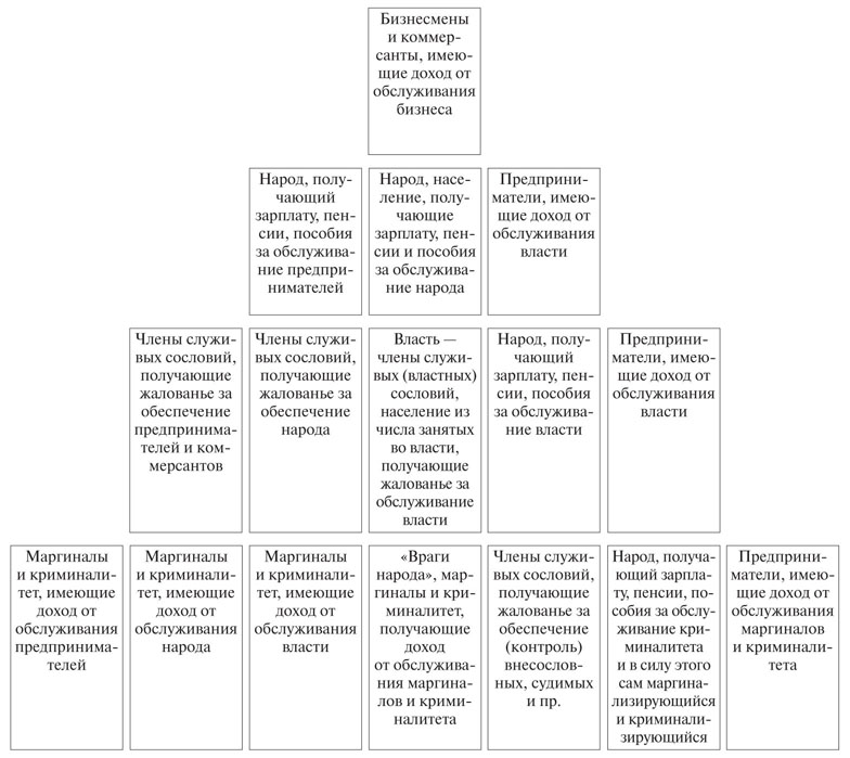 И четвертый, низший, уровень такого представления социальной структуры составляют члены властных сословий, получающие жалованье за обеспечение власти; «народ», получающий зарплаты, пособия и пенсии в силу своей причастности к власти; предприниматели, имеющие доход от обслуживания власти; маргиналы и криминалитет, связанные с властью; маргиналы и криминалитет, имеющие доход от обслуживания предпринимателей, и профессиональные маргиналы и преступники, имеющие доход от обслуживания других маргиналов и криминалитета.