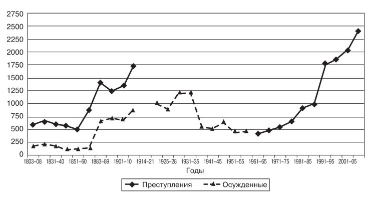 И до 1917 года, и в советское время между уровнями преступности и благосостояния отсутствовала логическая по здравому смыслу связь — когда уровень жизни повышался, преступность не снижалась, как можно было надеяться, а росла. Преступность имела тенденцию уменьшаться в периоды усиления социального контроля со стороны всех общественных и государственных структур и ограничения личных свобод. Если брать большие периоды времени, в России XIX–XX веков, как и всюду в мире, наблюдался устойчивый и, как правило, необратимый рост преступности: достигнув определенного рубежа, она стабилизировалась, но не снижалась. Были два исключения — царствование Николая I и сталинская эпоха, в обоих случаях преступность возвратилась к уровню конца XVIII века — времени расцвета крепостничества. Повышение преступности происходило скачками: в годы либеральных реформ она повышалась, а в консервативные годы стабилизировалась или росла медленно. Самое значительное увеличение преступности произошло после Великих реформ 1860-х годов — в 2,7 раза с 1851–1860 по 1883–1889 годы; после революции 1917 года и Гражданской войны — в 1,4 раза с 1911–1913 по 1931–1935 годы и после реформ конца 1980-х — начала 1990-х годов — в 2,6 раза с 1981–1985 по 2006–2010 годы.