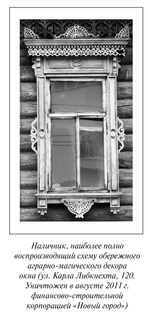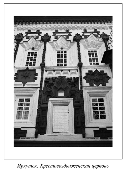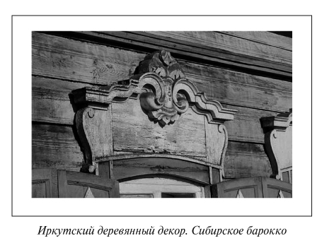 Но очень мало, практически ничего не пишут об огромном множестве деревянных иркутских домов, фасады которых украшены деревянными наличниками, представляющими собой две встречные волюты и центральный элемент — акротерий, выполненный в технике объемной резьбы.