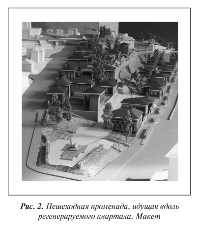 Мы стремились уже на стадии проекта привнести в квартал объекты культуры: разместить в нем помещения для выставок, для ремесленников, общественных организаций, деятельность которых связана с культурно-историческим наследием. В квартале предусмотрено размещение художественных галерей, антикварных лавок, ремесленных мастерских (столярных, гончарных, кузнечных); офиса Иркутского отделения ВООПИК, интерактивного музея и т. д. Объекты, выполняющие культурные функции, сконцентрированы вдоль внутриквартальной линейной пешеходной променады. Эта променада идет над трассой проходного коллектора, в котором будут проброшены внутриквартальные сети, что позволит вести ремонтные работы, не раскапывая каждый раз землю. Эта променада в случае нужды обеспечит свободный подъезд пожарных машин в любую точку квартала (рис. 2).