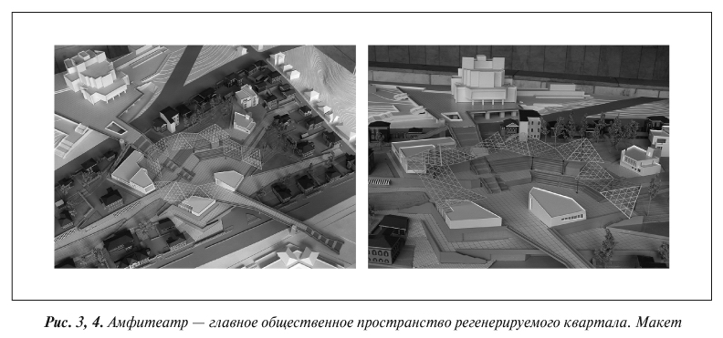 Пешеходный бульвар выводит на общественную площадь внутри квартала, расположенную над подземными пространствами. Мы специально не делаем ее горизонтальной, чтобы сохранить ярко выраженный ландшафт данного места, — мы превращаем ее в своеобразный террасированный амфитеатр (рис. 3, 4).