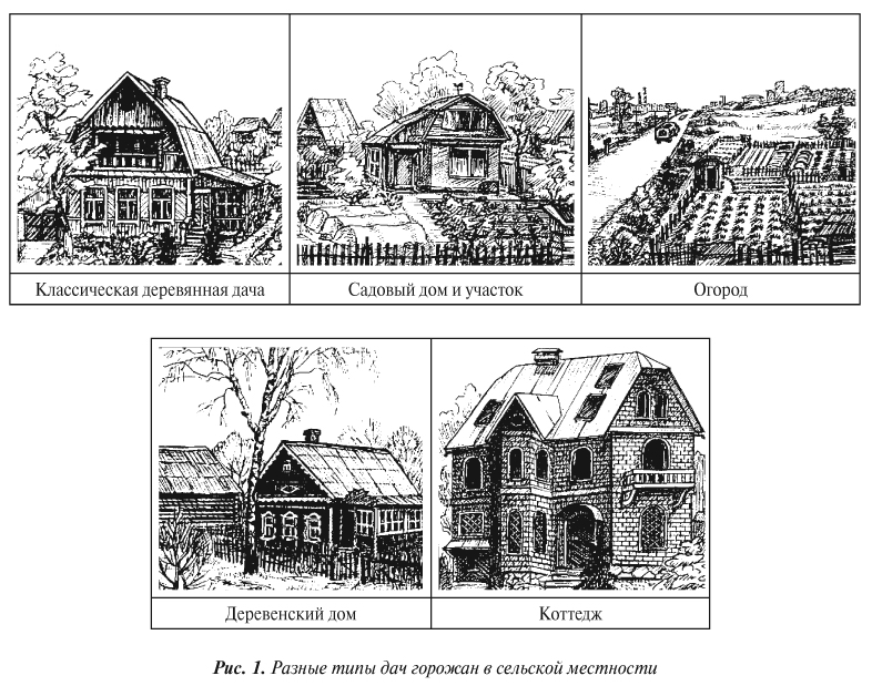 Можно выделить пять видов второго жилья горожан в сельской местности[2]: классические дачи, сады, огороды, сельские дома в деревнях и особняки или коттеджи.