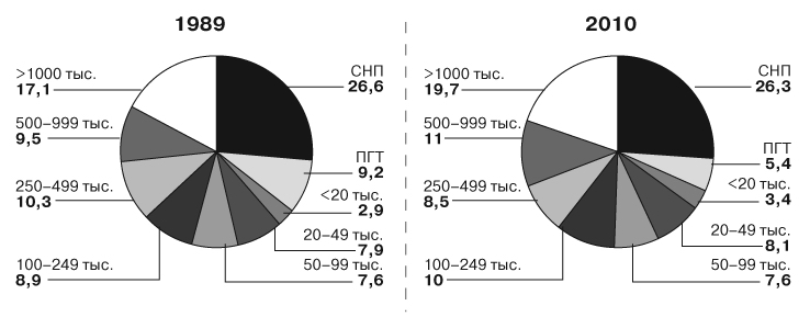 В настоящее время население страны делится на три не вполне равные части — городскую (население городов с людностью свыше 250 тыс. чел. — 39,2 % в 2010 г.); городско-сельскую и сельско-городскую (25,7 %); преимущественно сельскую (сельские поселения, пгт и города до 20 тыс. чел. — 35,1 %). За два десятилетия, прошедших между последней советской переписью населения 1989 года и Всероссийской переписью населения 2010 года, произошли значительные изменения в пространственной организации жизни населения. Эти изменения связаны как с новой экономикой, возникшей в России после 1992 года и резко поменявшей само устройство жизни, так и с теми явлениями, которые назревали давно — например, исподволь наступающей депопуляцией. Благодаря соседству с бывшими союзными республиками и активному пополнению России мигрантами оттуда, депопуляция была серьезно компенсирована. Кроме того, она обнажила и без того точечное, негустое созвездие российских городов. Если полтора века назад урбанизация спорила с колонизацией (а точнее с метрополизацией собственного огромного пространства), то теперь вопрос перешел в иную плоскость. На наш взгляд, он звучит сегодня так: что хуже — отсутствие прослойки мощных городов-центров, способных продуцировать новые стандарты городской жизни и задавать импульсы всей системе, или постепенное исчезновение мелких городов, которые являются тканью системы городских поселений? На повестке и следующая дилемма: чем жертвовать — развитием крупнейших городов или существованием малых? На самом деле это вопрос о том, что важнее — голова или шея. По словам В. Л. Каганского, «большой город — не замена малому, а малый — это не недоросший большой... Все нужны друг другу»[43]. Наконец, третий вопрос: надо ли вмешиваться в развитие урбанизационной системы, если потенциальные выгоды и издержки не просчитаны и риск ошибочных решений чрезвычайно велик, или положиться на естественное развитие событий? Определенно ясно одно: все эти пространственные процессы сами по себе очень региональны, и сюжеты будут неодинаково развиваться в разных частях и регионах России.