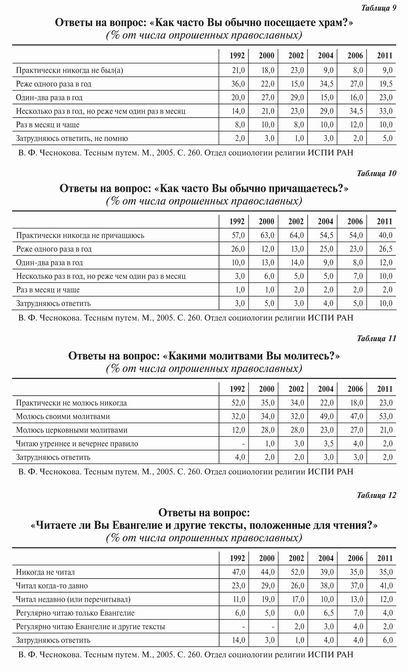 Исследования 2004 и 2006 годов показали, что из пяти показателей воцерковленности превалируют посещение храма и молитва. Данные исследования 2011 года демонстрируют некоторое снижение доли православных, молящихся церковными молитвами, а также регулярно читающих Евангелие. Процент регулярно посещающих храм остался практически неизменным. Зато выросла доля тех, кто регулярно причащается, а это важный показатель воцерковленности. Пост в данном отношении не столь показателен, тем не менее следует отметить, что доля не соблюдающих посты существенно снизилась. По всем показателям снизилась также доля респондентов, которые выбрали «нулевую» позицию — никогда не были в храме, никогда не причащались, никогда не молились, никогда не читали Евангелие, никогда не постились. Особенно заметно снизился процент не молящихся — с 52 % в 1992 году до 20 % в 2011-м, а также не соблюдающих посты — с 86 % в 2000 году до 55 % в 2011-м.