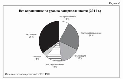 С нашей точки зрения, полученные данные говорят об определенной стабилизации роста доли православных респондентов. Исследование 2011 года подтвердило отмеченную многими особенность религиозной ситуации в России: доля респондентов, относящих себя к православным, превышает долю тех, кто считает себя верующим. Это означает, что часть неверующих граждан считают себя принадлежащими православной культуре и в этом смысле православными. 8 % респондентов не относит себя к какой-либо конфессии. Большую часть этой группы составляют неверующие — 68 %, колеблющиеся — 7 %, верующие — 4 %. Таким образом, верующие вне конфессии — это пока очень небольшая группа.