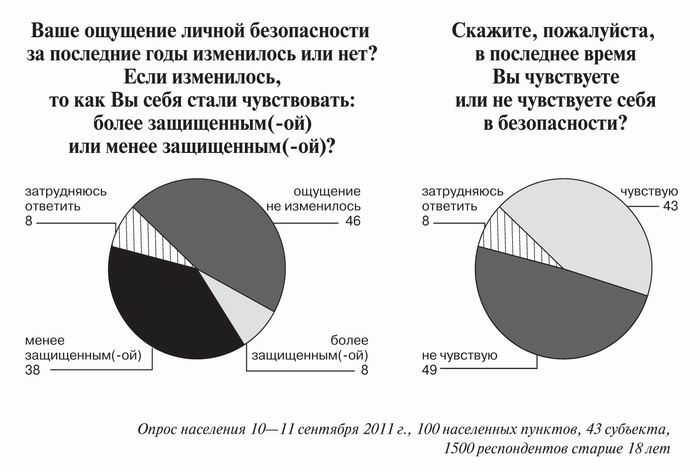 Но что же именно порождает у людей тревогу, чувство незащищенности? Ответили на соответствующий открытый вопрос («Почему Вы не чувствуете себя в безопасности?») 47 % респондентов: тем, кто чувствует себя в безопасности, он, естественно, не задавался, а некоторые из числа тех, кого спросили, не дали объяснений. Наиболее распространенной — но все же далеко не доминирующей — оказалась «криминальная» версия: 11 % опрошенных (или почти четверть от ответивших) на разные лады говорили о разгуле преступности, хулиганства: «страшно ходить по улицам, могут напасть»; «бандитов полно везде»; «слухи о маньяке»; «преступность растет, а я одна живу»; «ограблены квартиры в подъезде»; «в нашем городе часто убивают людей»; «подонков стало намного больше, и от них можно ожидать всего»; «в нашей стране преступники чувствуют себя очень хорошо»; «по телефону звонки без конца, телефонных вымогателей много всяких разных»; «по телевизору показывают одни убийства». Многие (6 %) развивают ту же тему, смещая акцент, — они обвиняют правоохранительные органы в бездействии: «полиция нас не охраняет»; «у нас нет даже участкового»; «менты не работают»; «милиция сама себя защитить не может»; «нет у нас хороших полицейских»; «полиция как не работала, так и не работает, а сама насилует и избивает».