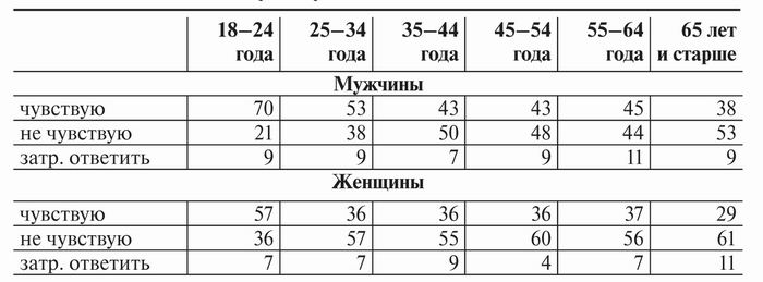 Дефицит безопасности, как видим, ощущает половина россиян. Чтобы понять, что стоит за этим ощущением, посмотрим прежде всего, кому оно присуще в большей, а кому — в меньшей степени. Как видим (см. табл. ниже), мужчины всех возрастных когорт испытывают его реже, чем их ровесницы, а молодежь — реже людей постарше. Последнее понятно и естественно: здоровье, физические силы, не слишком еще богатый опыт потрясений и стрессов, во многих случаях пребывание под крылом родителей или по крайней мере сознание, что в случае чего к их помощи можно прибегнуть, — все это, конечно, помогает молодым чувствовать себя в безопасности. Однако любопытно, что если применительно к девушкам этот «бонус» исчезает очень рано (уже вторая выделенная возрастная когорта, 25—34-летние, в данном отношении не отличается от представительниц старших групп), то мужчины у порога 30-летия чувствуют себя пусть и не столь безмятежно, как в 18—24 года, но все же намного реже испытывают дефицит безопасности, чем те, кто постарше. Можно усмотреть в этом как отражение гендерного неравенства в российском обществе, так и аргумент в пользу известного тезиса об инфантилизме, запоздалом взрослении современных мужчин. Возможны, несомненно, и иные объяснения.